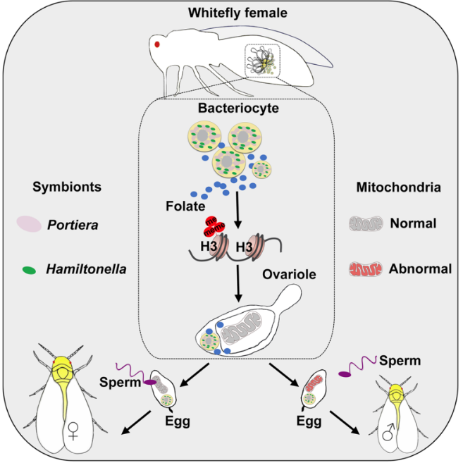 烟粉虱是一类世界性重大入侵害虫,严重危害蔬菜等农作物。共生菌在烟粉虱危害成灾中起关键作用。昆虫共生菌经卵传播并调控宿主生殖,然而其分子机制知之甚少。栾军波教授团队研究发现,烟粉虱含菌细胞共生菌Hamiltonella合成的叶酸通过介导组蛋白甲基化修饰调控烟粉虱卵巢线粒体功能,从而影响烟粉虱受精和后代性比。研究解析了共生菌——线粒体互作在调控宿主性比中的重要作用,揭示了共生菌调控宿主生殖的新机制。研究成果拓展了对宿主与共生菌互作机制的理解,为粉虱的精准防控提供了新靶标。